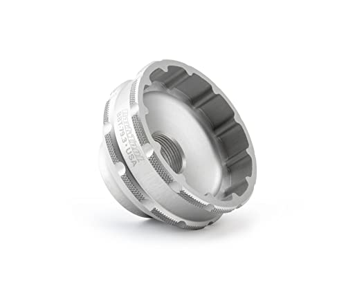 A precision CNC-machined aluminum tool for the installation and removal of select threaded bottom brackets with 12-notch tool fittings, including SRAM BSA DUB, Rotor BSA30, and others. Manufactured in-house by Park Tool, anodized for easy identification and featuring a ratchet/torque wrench-compatible 3/8" drive. The BBT-79.3 features integrated threads for full compatibility with the Park Tool BBT-RS Bottom Bracket Tool Retaining System (sold separately). The BBT-RS uses an adjustable spring-based tension system to apply consistent, adjustable pressure to the tool, ensuring full engagement with the tool fitting and preventing slippage.