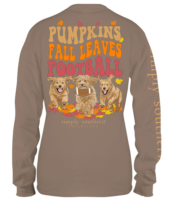 Army brown LS shirt with the phrases PUMPKINS, FALL LEAVES, and FOOTBALL and a trio of puppies running through fall leaves with a football.