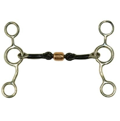 Stainless steel junior cow horse roller dog bone gag bit, sweet iron smooth dog bone snaffle with copper roller, 5-1/2" cheeks with gag effect. The copper roller keeps the horse relaxed while the gag effect helps you collect the horse. Good for young to intermediate horses. (Moderate effect)